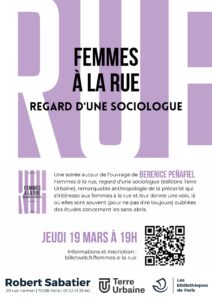Jeudi 19 mars, à 19h, Berenice Penafield est invitée par la Bibliothèque Robert Sabatier pour parler des femmes à la rue, de son ouvrage, et de ses récentes recherches autour de la menstruation menées sur le terrain, à Paris. Pour plus d’information, c’est ici
